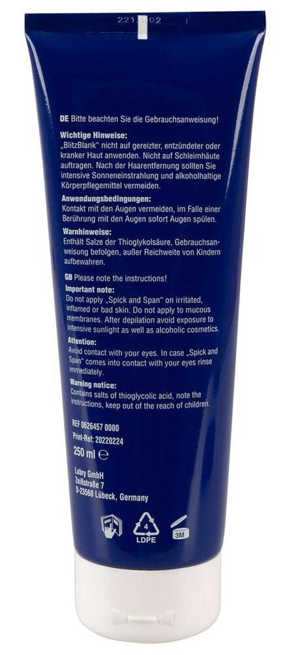 Diese Enthaarungscreme BlitzBlank entfernt schonend und sanft lästige Härchen. Die Haut wird streichelglatt und sieht gepflegter aus. Einfach BlitzBlank großzügig auf die zu enthaarenden Körperpartien auftragen, je nach Stärke der Haare 10 bis 20 Minuten einwirken lassen und danach die Haare mit beiliegendem Spatel gründlich entfernen und mit klarem Wasser nachspülen. Wohlduftend.
